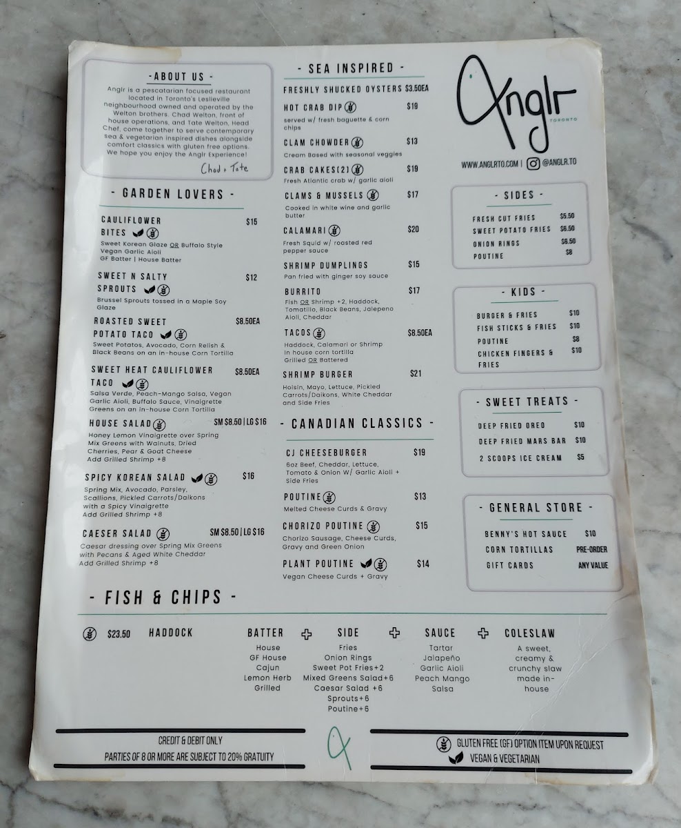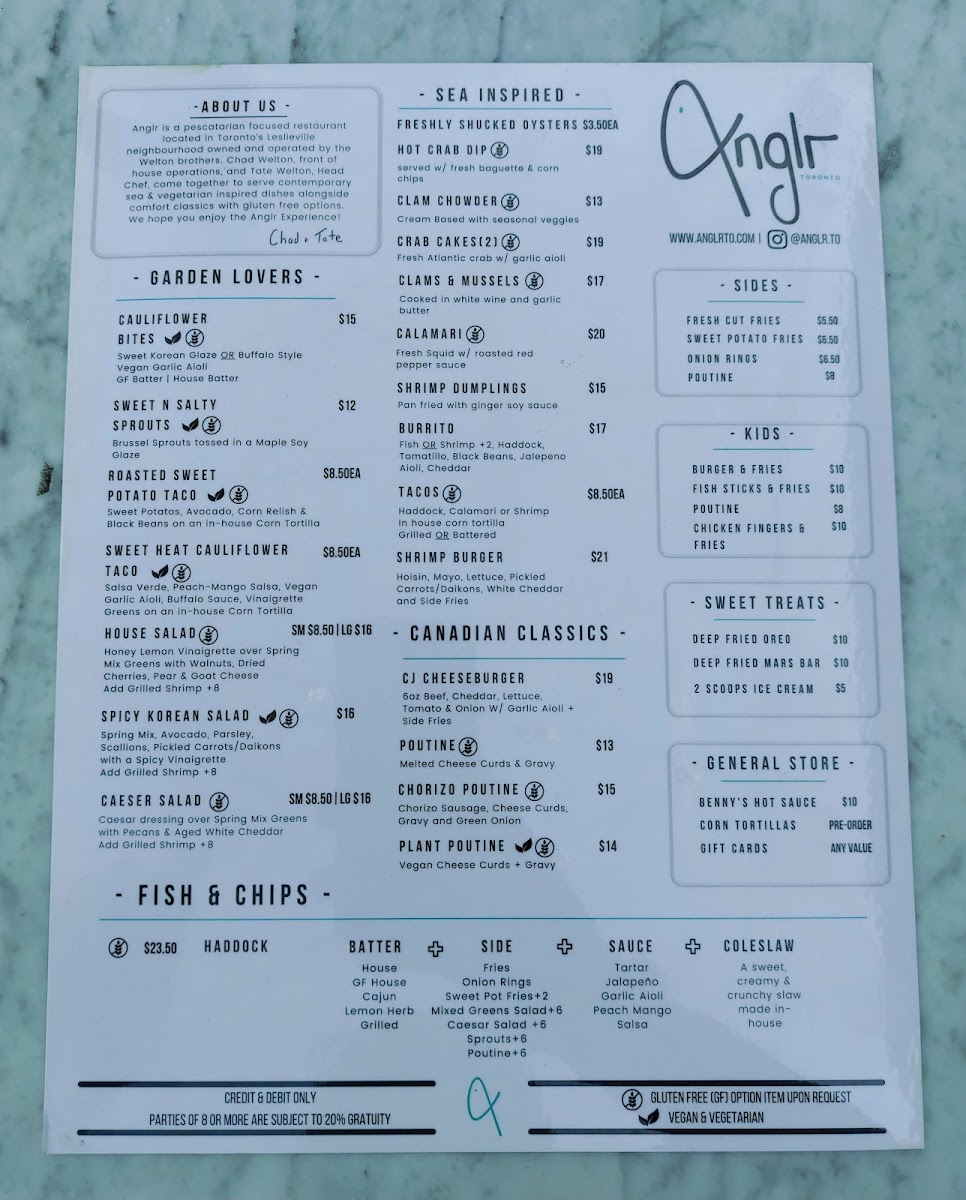 Welcome to ANGLR, a delightful culinary gem located at 1054 1/2 Gerrard St E in Toronto. This restaurant stands out for its vibrant and flavorful menu, focusing on fresh, high-quality ingredients. One of the highlights is their deliciously crafted Cauliflower Bites and Roasted Sweet Potato Tacos, perfect for garden lovers and those seeking gluten-free options.